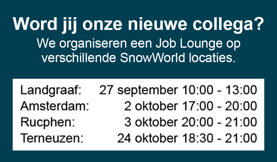 Als medewerker van SnowWorld ben jij onderdeel van het grootste indoor wintersportdorp van Europa. Jaarlijks komen er zo’n drie miljoen bezoekers af op de pistes van acht verschillende vestigingen in Nederland (5), Duitsland (1), België (1) en Frankrijk (1). Elke dag zetten wij ons voor de volle 100% in om alle wintersporters een unieke ervaring te geven. Wil jij hieraan bijdragen? Word dan ook onderdeel van ons energieke team! Bovendien zijn er aantrekkelijke voordelen voor jou als SnowWorld-medewerker: